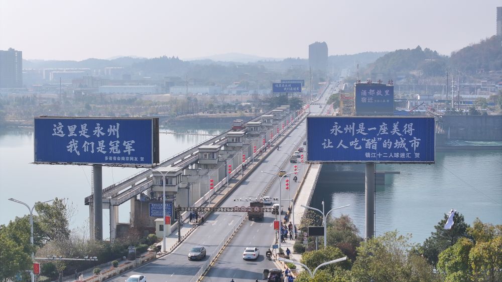 “这里是永州,我们是冠军。苏州网友贺”——元旦过后,随着一块“苏籍”祝福广告牌的出现,永州队的故事在江苏传播渐广。此后,永州城区不断涌现来自江苏的祝福——“这里是永州,我们是冠军。多省省会南京网友贺”“湘超黑马,冠军永州。苏超冠军泰州网友贺”“永州是一座美得让人吃‘醋’的城市。镇江十二人球迷汇贺”。